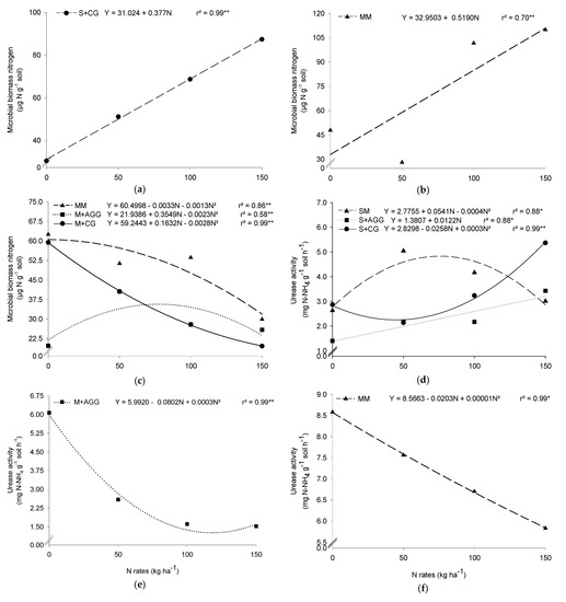Soybean–Congo grass intercropping in the second soybean crop showed an increase in soil MBN with increasing nitrogen rates, indicating the synergy of plants intercropped with adequate nitrogen rates (Table 2 and Figure 4a). Such an increase in MBN may have favored UA increase under the same conditions (Figure 4d), since, with an increase in nitrogen incorporated into the microbial biomass, there is greater availability of substrate for the enzyme to act [2,23,24,28].