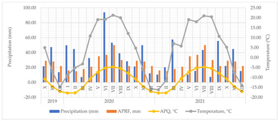 Meteorological data during the experimental period (https://www.kazhydromet.kz). Abbreviations: APRF, long-term average rainfall; APQ, average long-term temperature. (accessed on 11 December 2022).