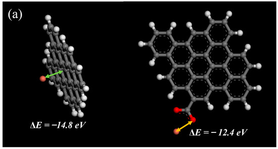 The Cu(II)/Pb(II) sorption process at the molecular level and the energy shift between atomic contacts was simplified with Density Functional Theory (DFT) calculations. The DMol3 package in the Materials Studio 2019 software was used for theoretical calculations and geometric optimization. The electronic basis was set as DND 3.5 with the function of B3LYP. We established an aromatic model of biochars and a -COOH model of biochars to calculate the energies of complexation and cation–π interactions. The interaction energy (ΔE) was described as