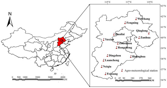 The study area covers Beijing, Tianjin, and Hebei Province, located between 36°05′–42°37′ N and 113°11′–119°45′ E. In this study, 13 representative agricultural meteorological experimental stations established and managed by the China Meteorological Administration (CMA) within this area were selected (Figure 1). The purpose of these agricultural meteorological experimental stations is to investigate local crop production and agricultural meteorological changes, and provide planting management advice to local farmers. They differ in geography and climate, and have good records of weather and crop data from 1981 to 2017.
