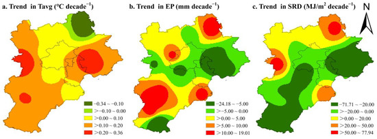 Spatial distribution of climate trend rates for average temperature (Tavg) (a), accumulated effective precipitation (EP) (b), and accumulated solar radiation (SRD) (c) during the entire growth period of maize from 1981 to 2017.
