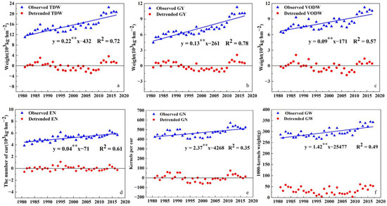 Observed and detrended values of dry matter accumulation indices and yield traits. ‘**’ denotes significant trends at the 1% probability level.