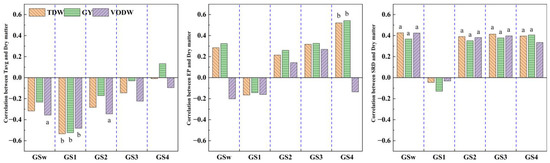 Partial correlation between climate factors and dry matter accumulation indices during the entire growth period and each growth stage of maize; correlations marked with “a” are extremely significant at the 0.05 level, and correlations marked with “b” are extremely significant at the 0.01 level.