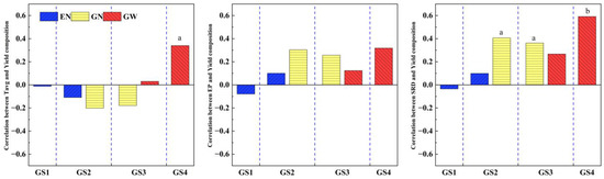 Partial correlation between climate factors and yield traits during corresponding growth stages. Correlations marked with “a” are extremely significant at the 0.05 level, and those marked with “b” are extremely significant at the 0.01 level.