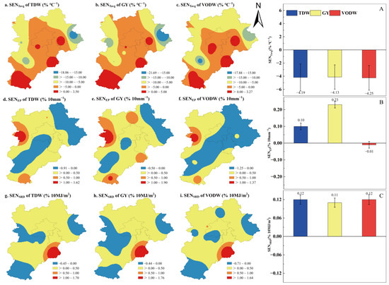 Spatial distribution of the sensitivity of dry matter accumulation indices to average temperature (SENTavg) (a–c), accumulated effective precipitation (SENEP) (d–f), and accumulated solar radiation (SENSRD) (g–i) throughout the entire maize growth period. The bar graphs show the average sensitivity and standard error (represented by error bars) of dry matter accumulation indices to average temperature (A), accumulated effective precipitation (B), and accumulated solar radiation (C).