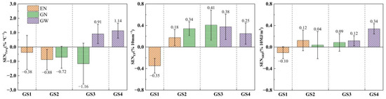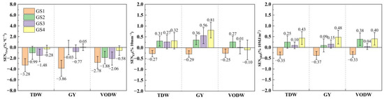 TDW, GY, and VODW are most sensitive to Tavg during the GS1 stage, with each 1 °C increase in Tavg resulting in a decrease of 3.28%, 3.86%, and 2.78% in TDW, GY, and VODW, respectively. During the GS2–GS4 stages, VODW is more sensitive to Tavg than GY and TDW. TDW and GY are most sensitive to EP during the GS4 stage, with each 10 mm increase in EP resulting in an increase of 0.32% and 0.81% in TDW and GY, respectively. Conversely, VODW is significantly less sensitive to EP during the GS2–GS4 stages than TDW and GY. TDW, GY, and VODW are most sensitive to SRD during the GS4 stage, with each 10 MJ·m−2 increase in SRD resulting in an increase of 0.43%, 0.48%, and 0.40%, respectively (Figure 7). Different yield traits have different sensitivities to climatic factors at different growth stages (Figure 8). GN is more sensitive to climatic factors during the GS3 stage than during the GS2 stage, while GW is more sensitive to Tavg during the GS3 stage and SRD during the GS4 stage, respectively.