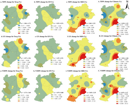 The spatial distribution of changes in TDW, GY, and VODW induced by variations in different climate factors during the entire growth period of maize was generally consistent (Figure 9). Under the joint action of the three climate factors, the regions in the central–western and central–eastern parts of China showed a decreasing trend, while the regions from north to south showed an increasing trend (Figure 9A–C). Among them, TDW and GY decreased by an average of 0.18% and 0.94%, respectively, while VODW increased by an average of 0.53%. The trend of Tavg changes resulted in a decrease in TDW, GY, and VODW in most regions, but the reduction was within 5% (Figure 9a,d,j). Except for the central–eastern region, the trend of EP changes caused a decrease in TDW, GY, and VODW within 5% (Figure 9b,c,h). The trend of SRD changes increased TDW, GY, and VODW in most areas, with an increase of 5% to 30% (Figure 9c,f,i).