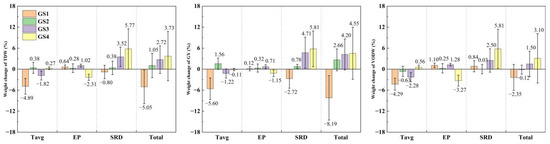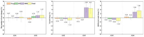 The effects of climate change on maize TDW, GY, and VODW varied across different growth stages (Figure 10). The negative impact of climate change (especially the increase in Tavg) on TDW, GY, and VODW was most evident in the GS1 stage, with reductions of 5.05%, 8.19%, and 2.35%, respectively. Climate change in the GS3–GS4 stages (especially the significant increase in SRD) increased the final weight of TDW, GY, and VODW (Figure 10). The upward trend of SRD in the GS3 stage resulted in increases of 3.52%, 4.71%, and 2.50% for TDW, GY, and VODW, respectively, while the upward trend of SRD in the GS4 stage led to increases of 5.77%, 5.81%, and 5.81% for TDW, GY, and VODW, respectively. In addition, the upward trend of SRD in the GS3 stage increased the number of grains by 5.00%, and the upward trend of seed weight in the GS4 stage increased by 2.84%. The effects of other climate factors on yield traits during the GS3–GS4 stages were relatively small (Figure 11).