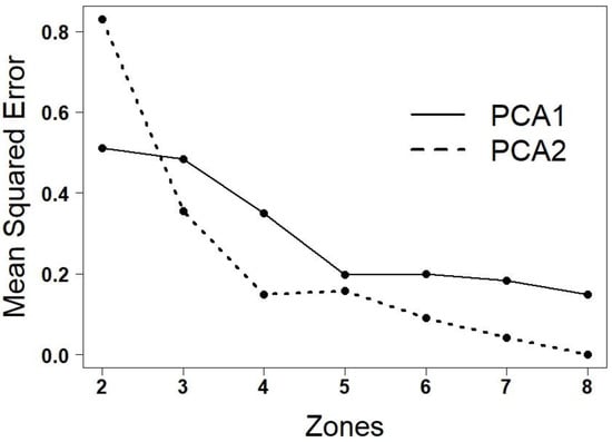 Scree plot showing mean squared errors associated with different number of zones based on K-means classification of Principal Components 1 (PCA1) and 2 (PCA2). Each black dot represents the associated mean squared error for the number of zones. The lines (solid PCA1, dashed PCA2) represent the change in mean squared error between zones.