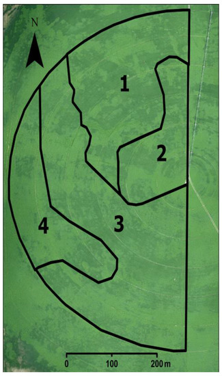 The alfalfa field (22.6 ha) was located near Rexburg, ID, USA (43.800966, −111.79014) (Figure 1). The soil type was Pocatello variant silt loam [30]. Pocatello soil is coarse–silty, mixed, calcareous, frigid, and Typic Xerorthents. The average annual precipitation was 339 mm with the majority of the precipitation falling as snow in the winter and early spring. The average growing season (April to September) temperature was 13.9 °C with an 80 to 100 frost-free-day growing season.