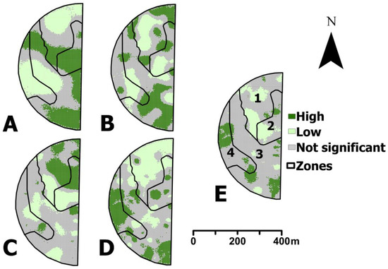 Statistically significant cluster of high and low measured LAI (m2 m−2) for Rexburg, Idaho, alfalfa field in 2021 and 2022. (A) 12 May 2021, (B) 2 June 2021, (C) 10 May 2022, (D) 15 June 2022, and (E) overall trend for 2021 and 2022. The zone map is outlined in each and labeled in (E) for all the figures.