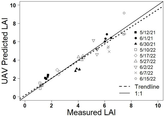 Throughout the growing season, the UAV-predicted LAI was consistent with the measured LAI. The trendline was close to the 1:1 line and was highly correlated with the measured LAI. While the UAV-predicted LAI model slightly overestimated LAI at values above 4, using the field average height overcame the point of saturation problem observed when UAV imagery was used alone to predict LAI.
