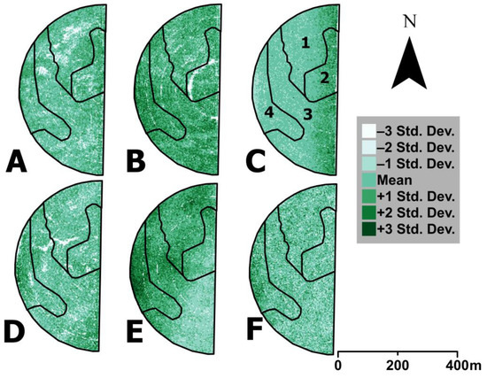 Maps of the standard deviation of LAI predicted from UAV imagery in Rexburg, Idaho, alfalfa field. (A) 12 May 2021, (B) 29 June 2021, (C) 1 June 2021 (zone numbers shown), (D) 10 May 2022, (E) 2 June 2022, and (F) 15 June 2022. The four zones are outlined in each map. LAI was predicted from the MLR equation using the MGRVI and field average height.