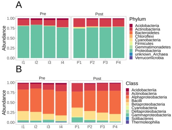 mOTU taxonomic affiliation relative abundances. (A) Phyla level mOTU taxonomic relative abundance using phyloseq R without rarefaction. (B) Class level mOTU taxonomic relative abundance using phyloseq R without rarefaction. Samples are labeled P1–P4 for post-fertilization, whereas pre-fertilization are labeled I1–I4.