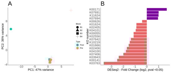 KEGG KO DESeq2 paired analysis for functional gene annotation. (A) DESeq2 MDS/PcoA ordination of the KO abundances paired by sample block (B1–B4) and post-fertilization. (B) Divergent barplot of the KO DESeq2 log2 fold changes post-fertilization, all with p-value < 0.05. Enriched (+ value) means more representation post-fertilization (purple), whereas depleted (− value) less representation post-fertilization (red).