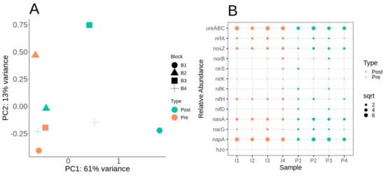 We further compared the N-cycling functional ORFs’ impact on the whole functional metabolic potential profile using DESeq2 paired analysis, followed by MDS/PCoA ordination. Similar to the KO MDS/PCoA ordination, samples did not cluster by pre- and post-fertilization (Figure 4A). However, as with the KO analysis, blocks 1 and 4 had greatly separated linearly post-fertilization for N-specific functional ORFs (Figure 4A). Functionally, it appears that certain blocks were more differentiated by post-fertilization based on metabolic potential. Comparing relative abundance of N-cycling genes suggests similar abundance for ureABC, nosZ, nasA, and napA (Figure 4B).