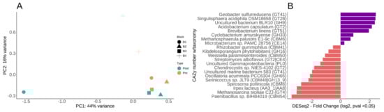 DESeq2 paired analysis of CAZy for carbohydrate active genes annotation. (A) DESeq2 MDS/PcoA ordination of the CAZy functional abundance paired by sample block (B1–B4) and post-fertilization. (B) Divergent barplot of the CAZy DESeq2 log2 fold changes post-fertilization, all with p-value < 0.05. Enriched (+ value) means more representation post-fertilization (purple), whereas depleted (− value) means less representation post-fertilization (orange).