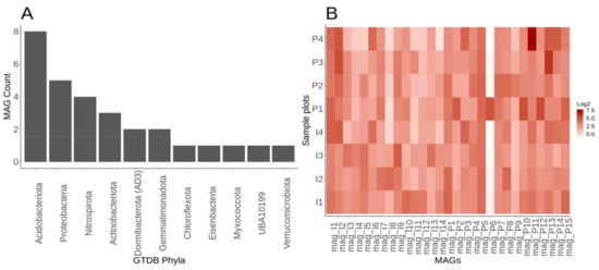 We obtained 190,172 > 5 kbp contigs in total from our 8 metagenomes and used the differential read abundance pre- and post-fertilization, which resulted in 29 MAGs from many phyla (e.g., Actinobacteria, Acidobacteria, Dormibacterota (formally candidate division AD3), Nitrospira, Gemmatimonadetes, Proteobacteria, and Verrucomicrobia). These MAGs represented high abundance (Actinobacteria, Acidobacteria, Proteobacteria, and Verrucomicrobia) and low abundance members (Nitrospira and Gemmatimonadetes) of common soil phyla, as well as members of the rare biosphere (Dormibacterota, Candidatus Eisenbacteria, and Candidate phyla UBA10199—formerly Deltaproteobacteria) (Figure 6A, Table 3). Acidobacteriota (Acidobacteria) phyla had the most representative MAGs with eight (Figure 6A, Table 3). The MAG genome sizes ranged from 2.5 to 11 Mbp, with a G + C content of 55 to 71.7% and a total contig range from 38 to 527 (Table 3). Amongst the 14 MAGs within the pre-fertilized samples, 2 are close to being high-quality drafts. High-quality drafts are defined by the minimum information about a metagenome-assembled genome (MIMAG) reporting guidelines at >90% complete, <5% contamination, and with the presence of one entire rRNA operon (5S, 16S, 23S) and 18 tRNAs []. The rest of the pre-fertilized MAGs were medium-quality drafts, and no low-quality drafts were used in downstream analysis. For the 15 MAGs within the post-fertilized plot, 8 were near high-quality drafts, with the rest being medium draft quality (Table 3).