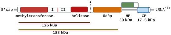 Schematic representation of the tomato brown rugose fruit virus (ToBRFV) genome organization adapted from Pfam (https://pfam.xfam.org/search/sequence (accessed on 1 December 2022)). The 6392-bp genomic sequence of ToBRFV-IL (Israeli) strain (NCBI: KX619418.1) was used. Four open reading frames (ORFs) corresponding to proteins are indicated by three open boxes. They encode a 126-kDa (top, shorter red line) and a 183-kDa (bottom, longer orange line) replication (REP) protein by readthrough of an amber stop codon, UAG (black asterisk), a 30-kDa movement protein (MP; green box, shifted up to indicate different reading frame than other ORFs), and a 17.5-kDa coat protein (CP; blue box). The first REP protein (126 kDa) contains two domains depicted by solid red boxes, a helicase, and a methyltransferase; in between the predicted domains, two non-conserved regions are located (indicated by I and II). The second REP protein of 183 kDa contains an additional RNA-dependent RNA polymerase (RdRp, solid orange box) domain at the C-terminus. The molecular weight of the proteins was predicted by Compute pI/Mw (https://web.expasy.org/cgi-bin/compute_pi/pi_tool (accessed on 1 December 2022)).