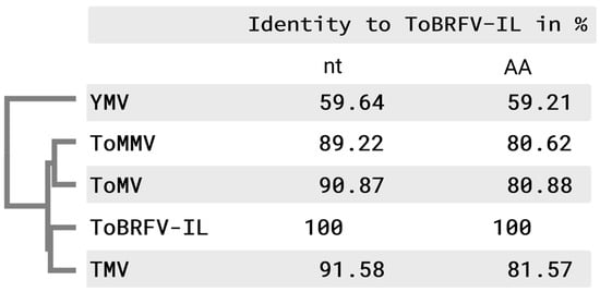 Comparison of the tomato-infecting tobamoviruses TMV, ToMV, ToMMV, and ToBRFV genome sequences showed that their sequences are very similar, with approximately 90% nucleotide (nt) identity and the concatenated ORF amino acid sequence with approximately 80% amino acid (aa) identity (Figure 2). The relationships among the different tobamoviral species were determined by comparison of complete concatenated ORF amino acid sequences and shown in a phylogenetic tree (on the left in Figure 2) [13]. Our phylogenetic analysis of nucleotide and amino acid levels indicates that ToBRFV-IL is most similar to TMV (91.58% identity on nucleotide and 81.57% identity on amino acid levels).