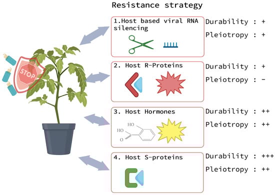 Four well-known strategies that plants use to become resistant against plant viruses are (1) RNA silencing mediated by the plant, (2) the presence of dominant plant resistance proteins (R-proteins), (3) plant hormone-mediated resistance, and (4) absence of a functional plant susceptibility factors (S-factors). Resistance strategies can differ in expected durability, and a strategy with high durability (+++) is preferred. Simultaneously, a specific strategy can have a negative impact on plant physiology and lead to pleiotropy, and a strategy with a low pleiotropic likelihood (−) is preferred. The durability of the pleiotropic effect on the plant as a result of the chosen resistance strategy is based on current knowledge and discussed for each strategy.