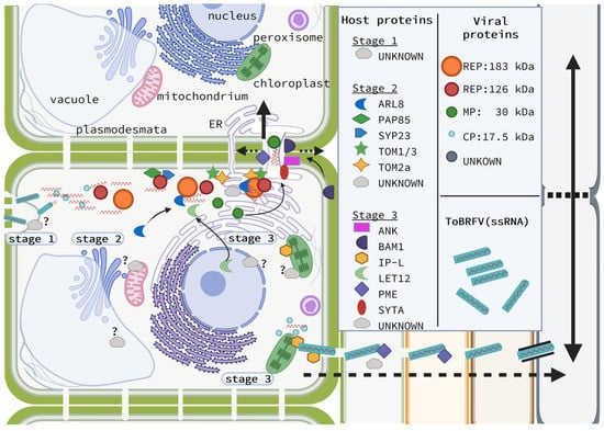 For each stage, viral and plant proteins are expected to collectively contribute to viral proliferation. As the life cycle of ToBRFV conceivably resembles that of TMV, based on the genome structure and sequence similarity (Figure 1 and Figure 2), it is likely that ToBRFV exploits similar host cell components as TMV (or ToMV and ToMMV) to cause disease. Therefore, in this review, we propose the host factors required for TMV and/or ToMV proliferation as the host factors for ToBRFV proliferation [52]. Figure 5 illustrates the three stages of the ToBRFV life cycle in the plant and how virus and plant proteins together could contribute to enhancing tobamovirus viral proliferation. Due to the mechanical transmission of tobamoviruses, most host factors are utilized by the virus during the second and third stages. Plant proteins that associate with the viral REP play a key role during the second stage, and those that associate with viral MP or CP are more relevant during the third stage. Obviously, as research continues, the depicted interactions and locations are not set in stone, and additional viral and plant proteins that take part in the ToBRFV proliferation remain to be discovered.