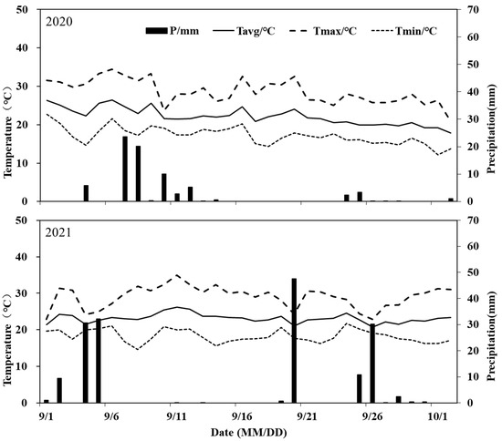 Field experiments were performed in the fall of 2020 and 2021, respectively, at the Graduate Practice Base of China Agricultural University in Rizhao City, Shandong Province, China (35°27′ N, 119°25′ E), with an altitude of 35 m. The experimental site has a temperate and monsoonal climate. An automatic weather station (SMC6152, Beijing Unism Technologies, Inc., Beijing, China) was installed in the experimental field to automatically observe and record air temperature and rainfall (Figure 1). The variation ranges of daily maximum temperature, daily minimum temperature, and daily average temperature in September 2020 were 20.8–34.4 °C, 12.2–22.7 °C, and 17.8–26.5 °C, respectively. The average temperature for the whole of September 2020 was 17.0 °C. The variation ranges of daily maximum temperature, daily minimum temperature, and daily average temperature in September 2021 were 20.4–29.7 °C, 15.8–23.0 °C, and 18.3–26.1 °C, respectively. The average temperature of the whole of September 2021 was 21.2 °C. Thus, the average temperature in September 2021 was nearly 4.2 °C higher than that in 2020. In September 2020, there was 64.8 mm of rainfall in total. In September 2021, the total rainfall was 160.8 mm, 96 mm higher than in 2020. Accordingly, the entire irrigation amount in 2021 was 40 mm, 42 mm lower than that in 2020.
