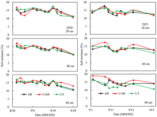 A downward trend for soil water content was observed during the picking season (Figure 3). The average soil moisture content within the 0–60 cm soil layer was 14.2% in September 2020, and 15.8% in 2021, 1.6% higher than in 2020. At the same nitrogen application rate, the average soil moisture content was 14.1% (AB), 14.7% (UAB), and 14.0% (U) in 2020, and 15.2% (AB), 16.5% (UAB), and 15.7% (U3) in 2021. At the 20 cm soil layer, the soil moisture content of each treatment did not vary, but the soil moisture content at 40 and 60 cm depths showed that the soil moisture content of the UAB treatment was higher than that of the U3 and AB treatments.