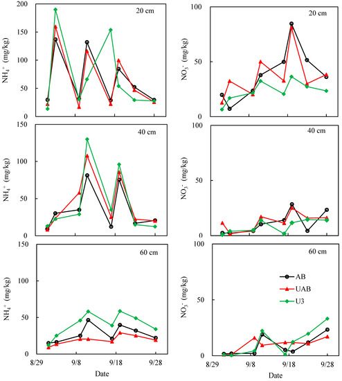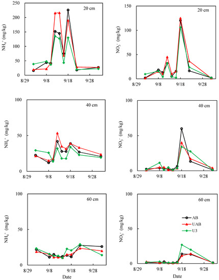 The fluctuation in soil nitrogen content at a 20 cm depth was greater than the fluctuations at 40 cm and 60 cm depths (Figure 5 and Figure 6) in 2020 and 2021. The concentration of NH4+ at the 60 cm soil layer basically fluctuated below 50 mg·kg−1, and the concentration of NO3− was basically below 50 mg·kg−1 in the 40 cm soil layer. No time lag was observed for the change of NH4+ or NO3− content at each soil depth. In September 2020, the concentrations of NH4+ and NO3− at 20 cm increased, and then decreased, three times; the content of NH4+ and NO3− at 40 cm increased, and then decreased, twice; and two more minor fluctuations were observed at the 60 cm soil layer. When the amount of applied N was the same, the concentration of NH4+ in the U3 treatment was higher than in the UAB and AB treatments. Within the 0–60 cm soil layer, the concentrations of NH4+ under the U3 treatment were always the highest, and NO3− under U3 was lower than that under AB and UAB. In September 2021, the concentrations of NH4+ and NO3− at 20 cm increased, and then decreased, twice; at 40 cm, the concentration of NH4+ fluctuated twice, and that of NO3− fluctuated only once; at 60 cm, the fluctuation was smaller than that at 40 cm. No matter the concentrations of NH4+ or NO3−, the difference between different treatments is not obvious.