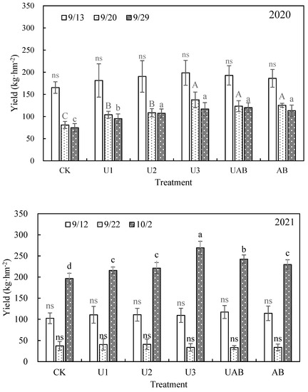 Although only a difference of two days was observed in the two-year harvest period in September, the rules presented by different batches were inconsistent (Figure 7). In 2020, the yield of the first harvest under each treatment was significantly higher than that of the second and third harvests. The U3 treatment had the highest yields on 13 September (198.6 kg·hm−2) and 20 September (137.8 kg·hm−2), and the UAB treatment had the highest yield on 29 September (120.0 kg·hm−2). No significant difference among the yields of all treatments was found on 13 September. The yields of the U3, UAB, and AB treatments on 20 September were significantly higher than those of the U1 and U2 treatments, which were significantly higher than the yields of the CK treatments. On 29 September, the yield of the U2 treatment was not significantly different from the yields of the U3, UAB, and AB treatments, and they were significantly higher than the yield of the U1 treatment, while the U1 treatment was significantly higher than the CK treatment. The average total yield of all treatments in the 2020 fall was 403.2 kg·hm−2. The U3 treatment had the highest total yield (450.6 kg·hm−2), 40.6% higher than the CK treatment. The total yields of the U3 and UAB treatments were significantly higher than the total yield of the U1 treatment, and the total yield of the U1 treatment was significantly higher than that of the CK treatment. No significant difference was found among the total yields of the U2, UAB, AB, and U3 treatments. When the applied nitrogen fertilization form was urea, the total yield of the U3 treatment was significantly higher than that of the U1 treatment (18.4%), and U2 and U3 had no significant difference.