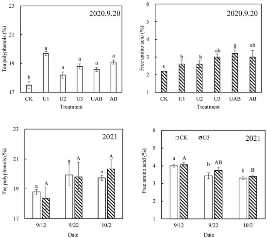 Comparison among N application forms on 20 September 2020, regarding free amino acid and tea polyphenol content of tea. Different letters represent significant differences at p < 0.05. A comparison of free amino acid and tea polyphenol content of tea in the U3 treatment with those of the CK treatments at three picking stages of autumn tea in 2021. The different lowercase letters represent the significant differences (p < 0.05) in the quality of each batch of tea under the CK treatment, and the different capital letters represent the significant differences (p < 0.05) in the quality of each batch of tea under the U3 treatment. The vertical bars represent standard deviations (n = 3).