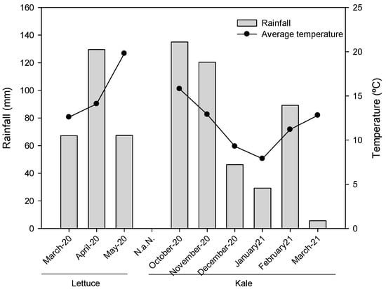 Both crops, lettuce and kale, were grown during two consecutive growing seasons (2020 and 2021). The digestate was manually incorporated into the soil 11 days before planting each crop. Then, plots were watered to maintain soil humidity at 80% field capacity, which is an adequate level for the correct growth of both crops [33]. Subsequently, two days before planting, preplant mineral N fertilizer was manually applied and incorporated into the soil. The lettuce had a crop cycle of 62 days (planted on 6 March 2020 and harvested on 7 May 2020). Topdressing N fertilization with mineral fertilizer was performed for the two crops at 22 and 49 days after planting or at the first date if only one topdressing was applied. The kale crop had a crop cycle of 152 days (planted on 15 October 2020 and harvested on 16 March 2021). Ammonium sulphate was used at preplant to reduce the risk of N leaching. The different mineral fertilizers and concentrations used in the experiment are described in Table 2. The soil for the experiment had a high level of available P (Olsen P = 149 mg kg−1) and potassium (K = 530 mg kg−1). Therefore, there was not an expectable response to the application of P and K fertilizers, and only N fertilization was performed.
