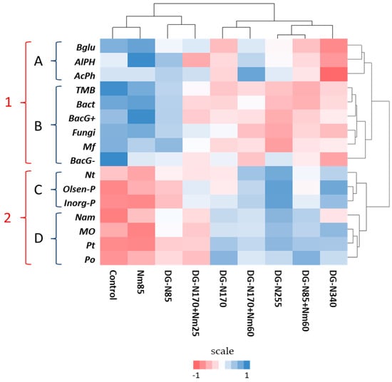 The heat map (Figure 2) showed that the treatments can be organized into two big clusters (Cluster 1 group 2) with different behaviors regarding their correlations with the chemical or enzymatic and microbiological soil properties. Concerning the treatments, the first group was composed of the control, Ni85, DG-N85, and DG-N170 + Nm25, which showed overall positive correlations between enzymatic and microbiological properties and negative correlations with soil chemical properties. The second group was formed by all the other treatments (DG-N170, DG-N170 + Nm60, DG-N85 + Nm60, DG-N255, and DG-N340) and was shown to have correlations with opposite trends.