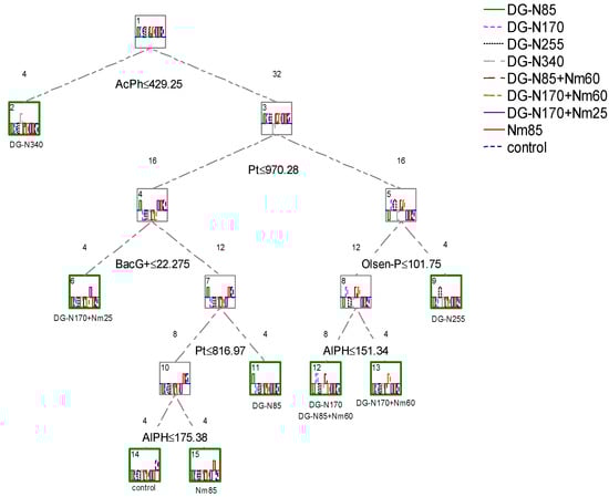 Regarding the classification tree (Figure 3), acid phosphatase discriminates DG-N340 from all the other treatments. Then, the level of soil total P discriminates two groups: the first group was composed of DG-N85, DG-N170 + Nm25, Ni85, and the control; and the second group was composed of DG-N170, DG-N255, DG-N85 + Nm60, and DG-N170 + Nm60. Next, node 4 with Gram+ bacteria discriminate DG-N170 + Nm25, and Olsen P discriminates DG-N85, Nm85, and the control. Node 5, using the soil Olsen P level, discriminates treatments DG-N170, DG-N85 + Nm60, DG-N170 + Nm60, and DG-N255. Node 7 discriminates treatments though the soil total P into DGN85 and another group consisting of Nm85 and the control. Node 10 discriminates these two last treatments through AlPh. Node 8 also used alkaline phosphatase activity to discriminate between DG-N170 and DG-N85 + Nm60 from DG-N170 + Nm60. Note that the treatments DG-N170 and DG-N85 + Nm60 cannot be separated by any soil property, suggesting that they have a similar effect on soil.