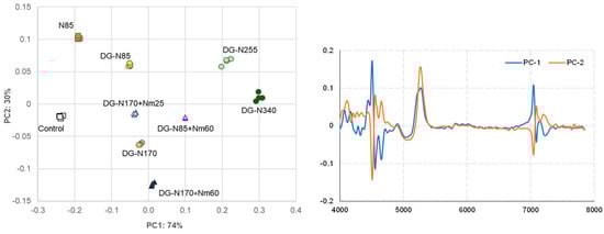 The correlation between soil samples obtained with PCA was quite similar to the results obtained with the heat map, but there were some differences, because with NIR we have information about all soil constituents and not only on the parameters measured in this work. Nevertheless, it is possible to plot that the most relevant regions for distinguishing the samples analyzed were from 4000 cm−1 to 5450 cm−1 and from 6970 cm−1 to 7347 cm−1 (Figure 4). PCA analysis showed that component 1 explained 74% of the total variability. This component clearly distinguishes the control group and N85 (the treatments without any fertilization or without DG) from the other groups with higher levels of DG application (DG-N255 and DG-N340). The other samples showed intermediate behavior. Component 2, which explains 30% of the total variation, distinguishes the control treatment from N85. This component is also responsible for the discrimination of DGN85 from DG-N170 + Nm60 (Figure 4).