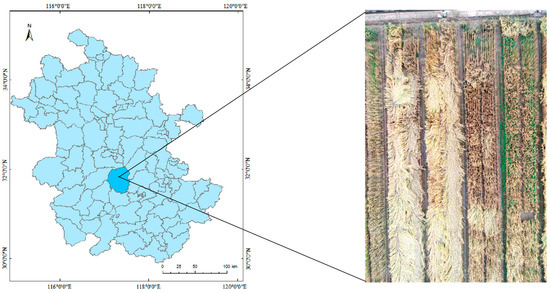 The research area is located in Guohe Farm, Lujiang County, Hefei City, Anhui Province. It is located in the middle of Anhui Province, between the Yangtze River and Huaihe River, and the west wing of the Yangtze River Delta, between 30°56′–32°33′ N, 116°40′–117°58′ E (Figure 1). It is in the subtropical warm monsoon climate zone. The annual climate characteristics are: four distinct seasons, mild climate, moderate rainfall, annual average rainfall of 992 mm, average temperature of 13–20 °C, suitable for wheat growth. Wheat is one of the main crops planted in this area. The wheat variety (Ningmai 13) was sown in October 2020 and belongs to the winter wheat. In addition to basic cultivation, it also carries out management in the process of wheat growth, such as weeding, fertilization, pest control, etc.