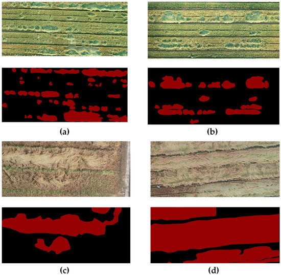 - Data annotation. The obtained UAV wheat image during the grain-filling period includes two kinds of data at the height of 20 m and 40 m, and the size of the original wheat lodging image collected is 5472 × 3648 and 8049 × 5486, respectively. Due to hardware constraints and adaptation to subsequent deep learning training, the images are uniformly cropped to the same size. The obtained UAV image has high spatial accuracy and can clearly see the lodging information of wheat. Therefore, Expert Visual Interpretation (EVI) is selected to obtain the landmark data of real lodging areas. LabelMe [19] is selected as the annotation software to manually label the data which is an open annotation tool created by MIT Computer Science and Artificial Intelligence Laboratory (MIT CSAIL). It is a JavaScript annotation tool for online image annotation. Compared with traditional image annotation tools, its advantage is that we can use it anywhere. In addition, it can also help label images without installing or copying large data sets in the computer. According to this software, real ground lodging information can be obtained. The lodging areas were marked in LabelMe to generate a JSON file which was then converted to a PNG format image for deep learning network training preparation. As shown in Figure 3, the red areas represent the lodging areas and the black represents the non-lodging areas.