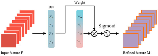 NAM is based on the standardized attention module which is an efficient and lightweight attention mechanism. It adopts the same integration mode as the Convolutional Block Attention Module (CBAM) [20] and redesigns the channel and spatial attention sub-module, mainly to improve efficiency by suppressing less significant features. Recognition of less significant features is the key compressing the model, thus reducing the amount of computation. The NAM [21] module uses the weight factor to improve the attention mechanism, uses the scale factor of the batch to standardize, uses the standard deviation to express the importance of the weight and identifies the less significant features. The NAM structure diagram is shown in Figure 5.