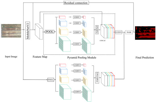 PSPNet was proposed by Zhao et al. [22] to develop global context information through context aggregation based on different regions. In this paper, taking the PSPNet network framework as the main body, the following improvements are made as shown in Figure 6: