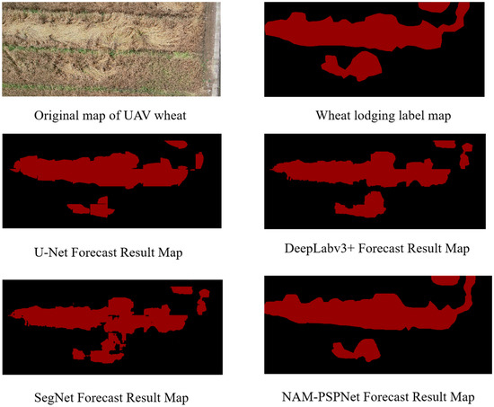 The four deep-learning models can be used to extract the lodging of wheat at different heights. It can be seen that the extraction effect of the lodging data of the 20 m wheat UAV is better than that of the 40 m wheat UAV. Therefore, the lodging area prediction is performed for the 20 m mature UAV data, and the lodging area prediction diagram is shown in Figure 7. It can be seen from the prediction diagram that the edges of some prediction results in the U-Net network prediction diagram are too angular; The prediction results of the SegNet network, although the overall results are in good agreement with the label chart, have some prediction errors and less prediction; The prediction results of DeepLabv3+ network also have some wrong predictions and few predictions; The prediction results of NAM-PSPNet network are closest to the sample label data. By comparison and analysis, it can be concluded that NAM-PSPNet is superior to the other three networks in the extraction of the lodging area of UAV wheat data at different heights.