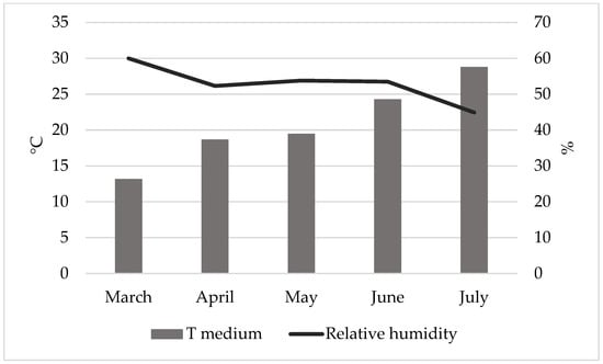 The temperatures and relative humidity detected during the experimentation are shown in Figure 1.