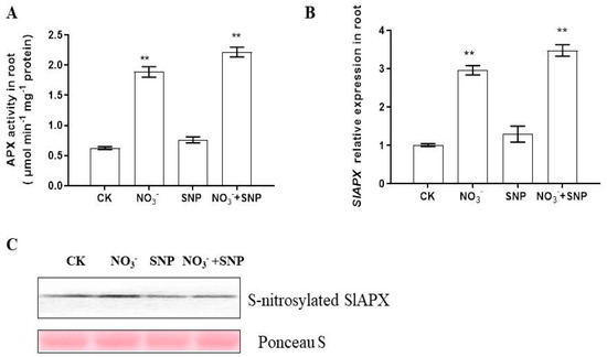 SlAPX protein was S-nitrosylated in tomato under nitrate stress and in vitro. The growth of SlAPX overexpressed plants was significantly better than that of WT under nitrate stress, with lower ROS accumulation, higher AsA/DHA ratio and antioxidant enzyme activities, and higher proline and soluble sugar contents. These results suggest that SlAPX is involved in mitigating oxidative damage under nitrate stress related to the S-nitrosylation of APX.