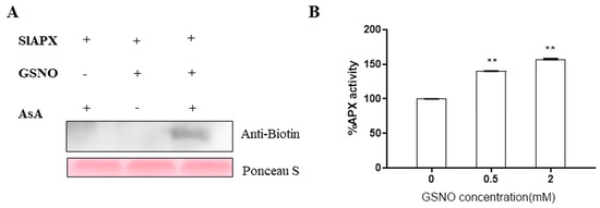 In order to analyze the S-nitrosylation level of SlAPX protein in vitro, the purified SlAPX protein was treated with or without GSNO for 30 min, and analyzed by biotin conversion method with or without AsA. The SlAPX activity was analyzed after GSNO treatment.