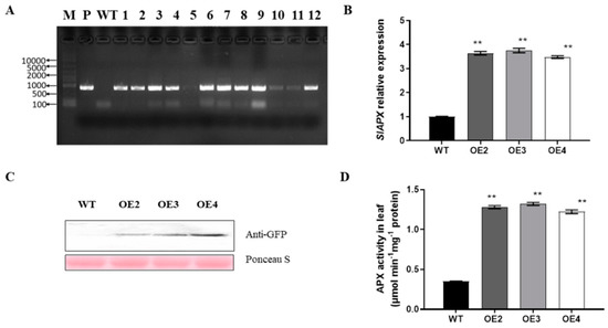 Figure 3. The genomic PCR (A), relative expression (B), protein expression (C), and APX activity (D) analysis in SlAPX transgenic tobacco plants. OE2, OE3, and OE4 were three different SlAPX overexpressed transgenic lines. p values < 0.01 are summarized with two asterisks.