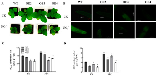 Figure 4. Effects of nitrate stress on the phenotype (A), ROS fluoresence (B), H2O2 contents (C), and MDA contents (D) in SlAPX overexpressing and WT plants. Transgenic and WT tobacco plants were watered with 50 mL of water as a control, or 50 mL of 150 mM nitrate solution once every 2 days for 2 weeks. Scale bar = 100 μM. p values < 0.05 are summarized with one asterisk, and p values < 0.01 are summarized with two asterisks.