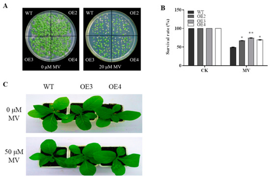 Seeds from transgenic and WT tobacco plants were soaked in sterile water at 55 °C for 30 min, and then sterilised with 4% NaClO for 20 min before being washed three times with sterile water. After that, the seeds were sown on Murashige Skoog (MS) agar plates (9 cm) with 0 and 20 μM MV, and the survival rate was analyzed after 10 days.