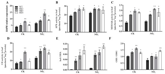 Figure 6. Effects of nitrate treatment on the key antioxidant enzymes activities and AsA/DHA, GSH/GSSG ratio in SlAPX transgenic and WT plants. Transgenic and WT tobacco plants were watered with 50 mL of water as a control, or 50 mL of 150 mM nitrate solution once every 2 days for 2 weeks. (A): Relative expression of SlAPX. (BD): Activities of APX, MDHAR, GR. (E,F):AsA/DHA and GSH/GSSG ratio. p values < 0.05 are summarized with one asterisk, and p values < 0.01 are summarized with two asterisks.
