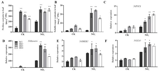 Figure 7. Effects of nitrate stress on proline (A) and soluble sugar (B) contents and expression of NtP5CS (C), NtOsmotin (D), NtDREB (E), NtLEA5 (F) in SlAPX overexpressing and WT plants. Transgenic and WT tobacco plants were watered with 50 mL of water as a control, or 50 mL of 150 mM nitrate solution once every 2 days for 2 weeks. p values < 0.05 are summarized with one asterisk, and p values < 0.01 are summarized with two asterisks.