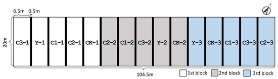 Each treatment was repeated 3 times, randomized block design in 15 experimental plots (Figure 1). The total area of the field experiment was about 2090 m2, and each plot was 20 m long and 6.5 m wide. All plots were separated by a ridge with height of 20 cm and width of 50 cm.