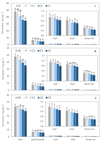 Cd contents in different rice organs in three years with biochar treatments. (A): results of the 1st year, (B): results of the 2nd year, (C): results of the 3rd year. The error bars indicate standard deviations (n = 3). The different letters on bars indicate significant differences (p < 0.05) between the biochar treatments. Changes in Cd accumulations in Leaf, Husk, and Brown rice are detailed in the partial enlarged figures. CK: control, Y: yearly 3 t ha−1, C1: 7.5 t ha−1, C2: 15 t ha−1, and C3: 30 t ha−1.